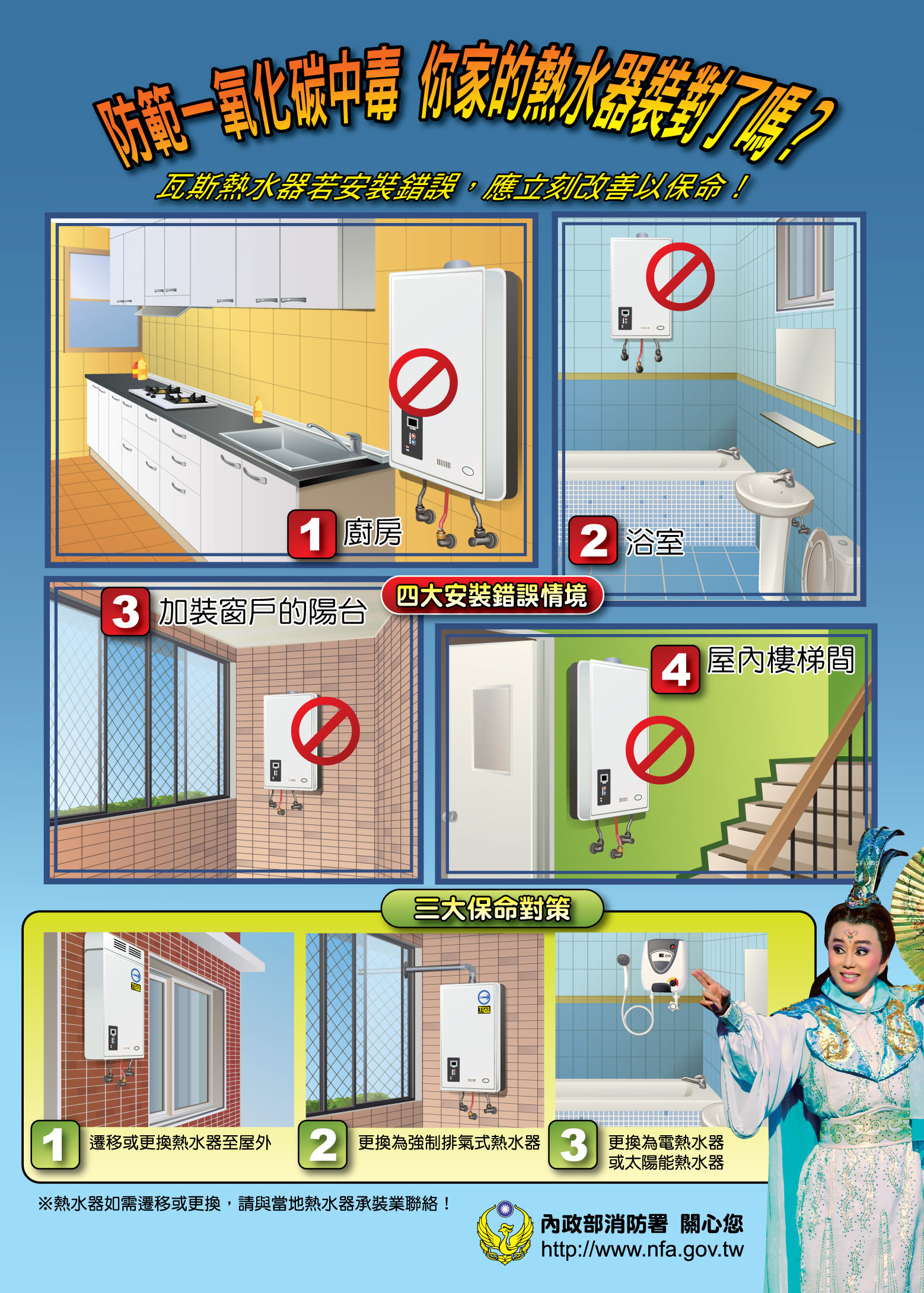 人體吸入一氧化碳後,經常會有頭痛、噁心、暈眩、昏迷等症狀,甚至導致死亡,如果使用燃氣設備(如燃氣熱水器)時,有上述症狀發生,要警覺可能是一氧化碳中毒,請立即停止使用燃氣設備,並打開通往室外的門窗通風,身體嚴重不適時,請先前往通風良好的室外環境,再打119電話求助;如發現一氧化碳中毒患者無呼吸心跳時,請保持冷靜,依照急救步驟實施心肺復甦術(CPR),直到救護車到場急救。